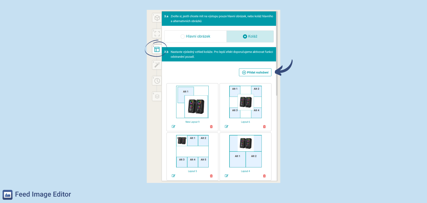 Vytvářejte skvělé koláže z vašich produktových obrázků. Máme pro vás šikovnou funkci, kterou najdete ve třetím kroku v naší aplikaci.